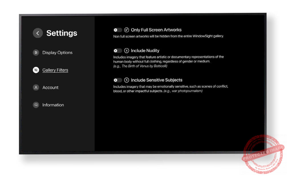 When these filters are disabled, artworks tagged as sensitive — including nudity and mature themes — will not appear anywhere in the app, helping ensure a safe and appropriate viewing experience for all ages.