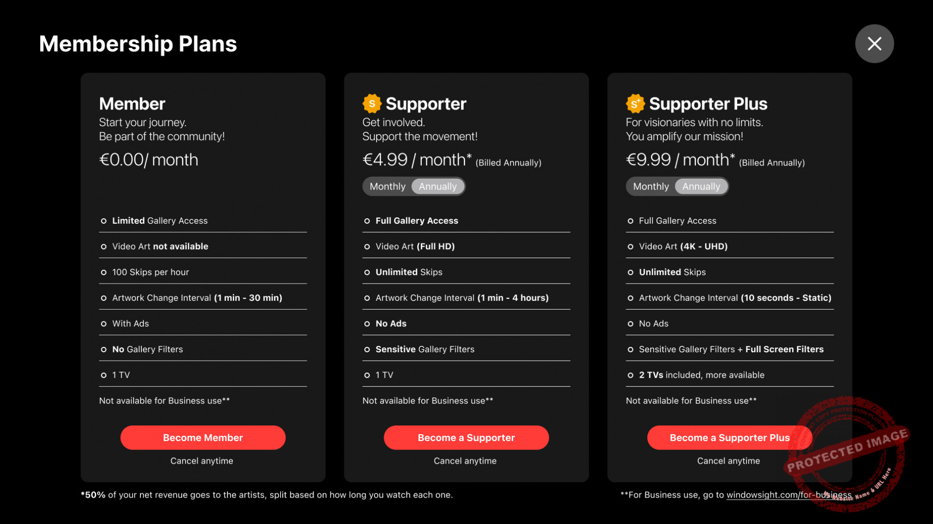We no longer call anyone a “free user.” Everyone who joins WindowSight is a Member of the community; which, of course, is still free. From there, members can choose to become Supporters or Supporter Plus (no longer Basic or Premium users),which helps fund artists directly and unlocks additional features.